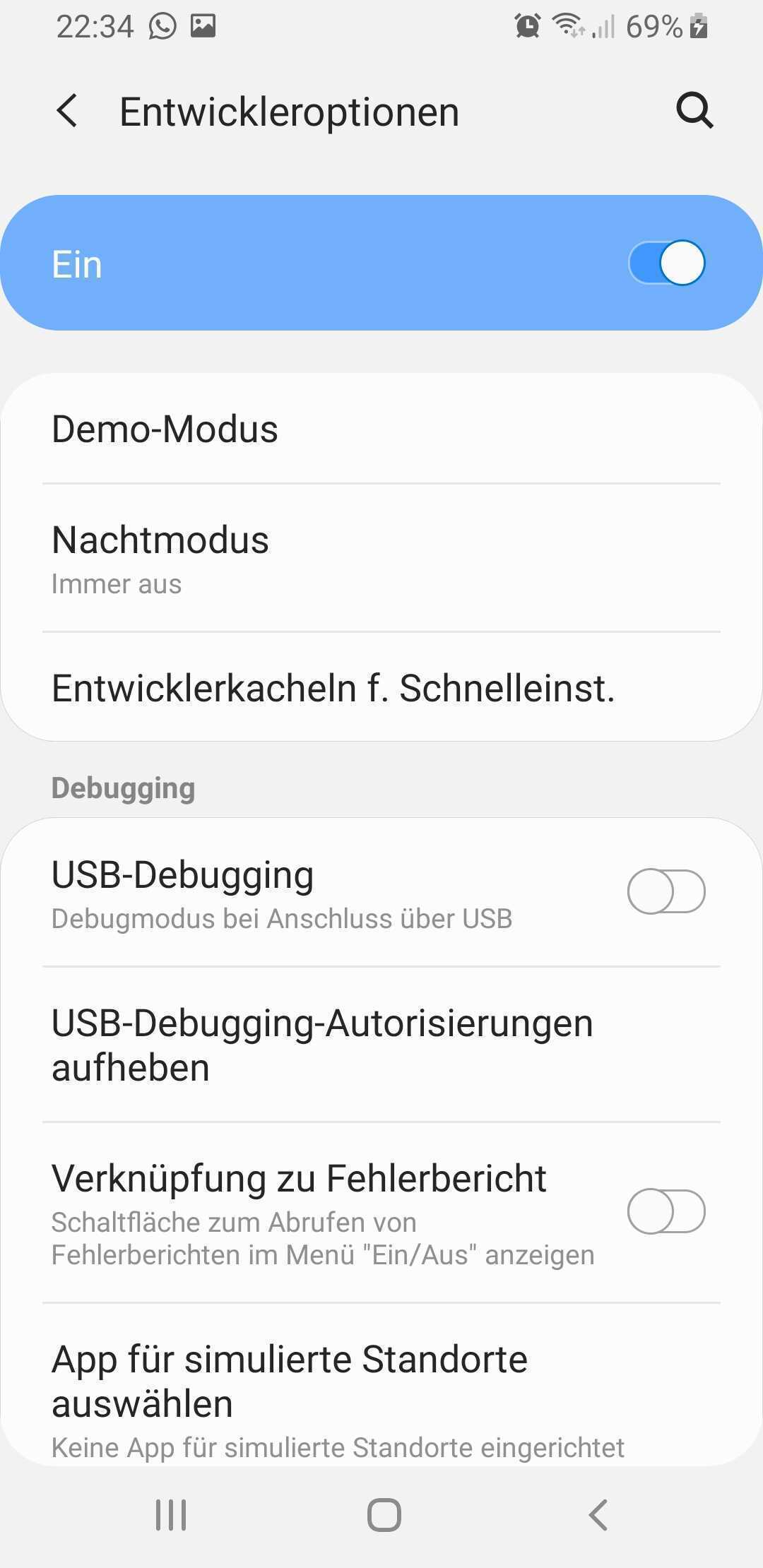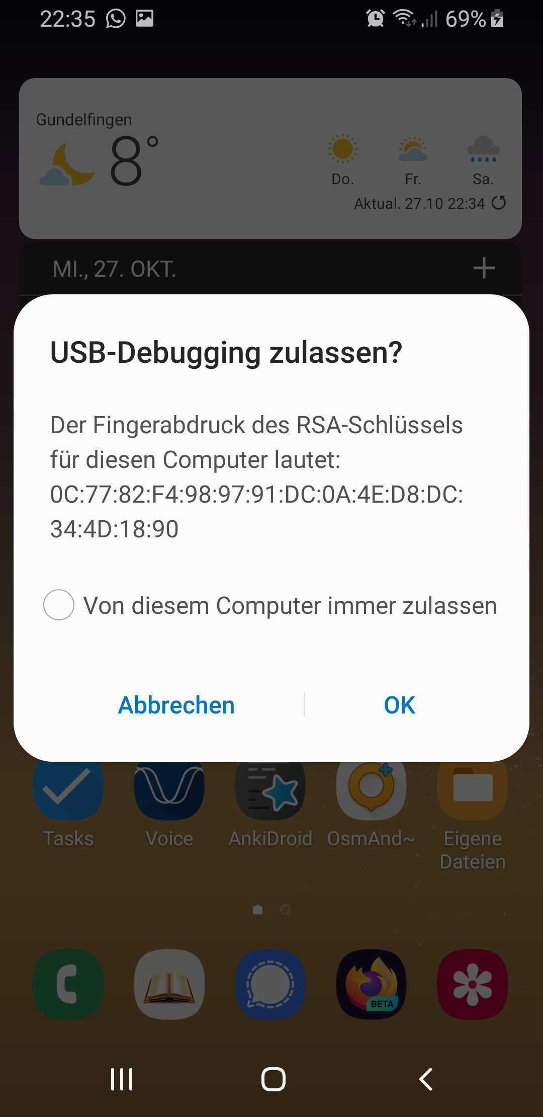 در طول مقاله از برنامههای اوپن سورس و آزاد مختلفی استفاده میکنیم که شرح خواهم داد. سیستم عامل هم آرچ لینوکس است و شل هم bash. پیش از هرچیز باید Android Debug Bridge یا همان adb را نصب داشت که من پیشتر نصب کردهام. adb devices هم باید گوشی را وقتی با کابل USB به دستگاه وصل است نشان بدهد. برای اینکار باید USB Debugging در تنظیمات برنامنویس یا Developer Options گوشی فعال باشد. خود Developer Option هم وقتی ظاهر میشود که در تنظیمات اندروید روی Build Number چند بار پشت سر هم کلیک کنید. بعد از اینکار و بعد با اتصال کابل USB و اجرای adb یک پنجره روی گوشی ظاهر میشود و میپرسد که آیا به این کامپیوتر اعتماد میکنیم یا نه. با اعتماد به کامپیوتر میتوانیم ادامه بدهیم. (در اسکرینشاتها میتوانید این مراحل را ببینید، زبان گوشی آلمانی است ولی به نظرم واضح است که منظور چیست.)